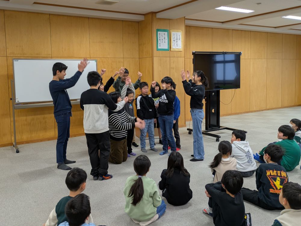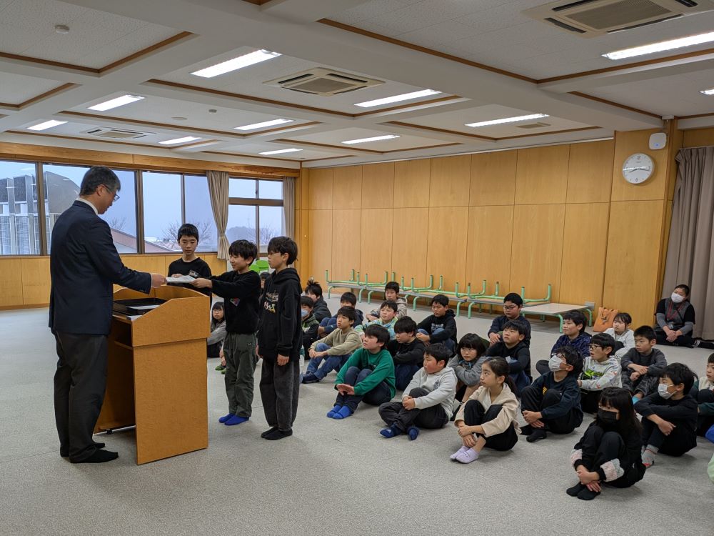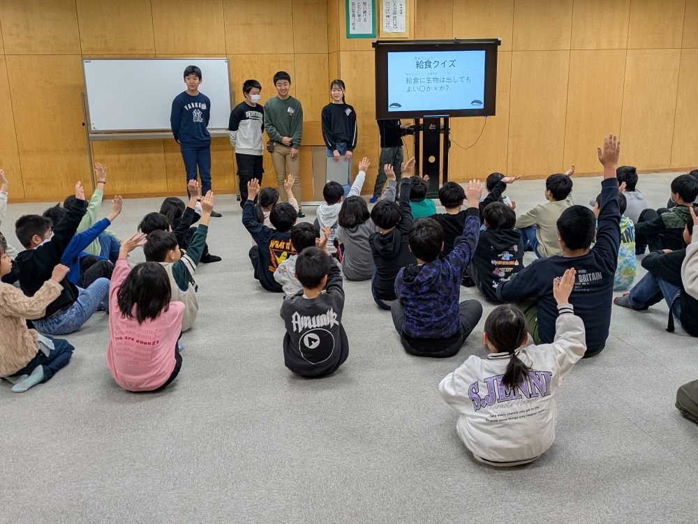 今回の朝会は、保健委員会が企画運営しました。給食感謝週間の一環として行いました。食事に関してのクイズや毎日給食の受け入れと準備をしてくださっている、庁務員の十二先生への感謝状渡しを行いました。クイズでは、たくさん正解できた人には、健康委員会から万歳のプレゼントがありました。