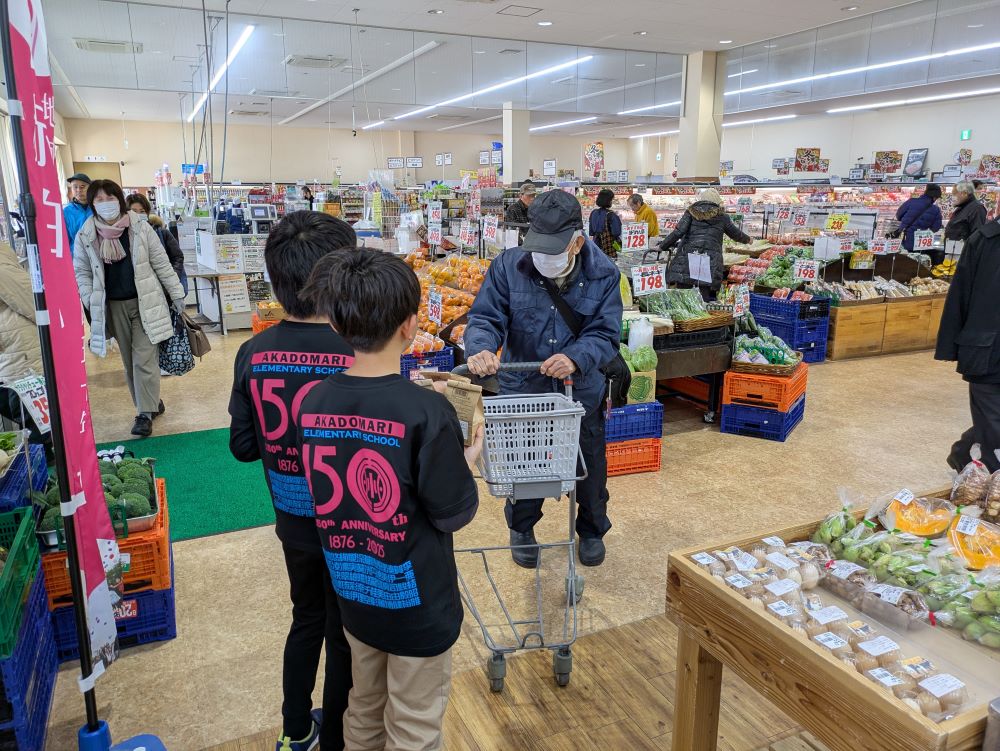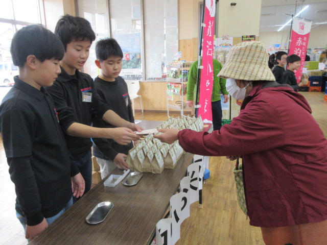 いざ、売り場に立った子どもたちは、これまで経験したことのない場や雰囲気に少し緊張した様子でした。開始早々にお客さんがお米を買ってくださったことで、緊張がほぐれたようで元気にお客さんを呼び込む姿が見られるようになりました。