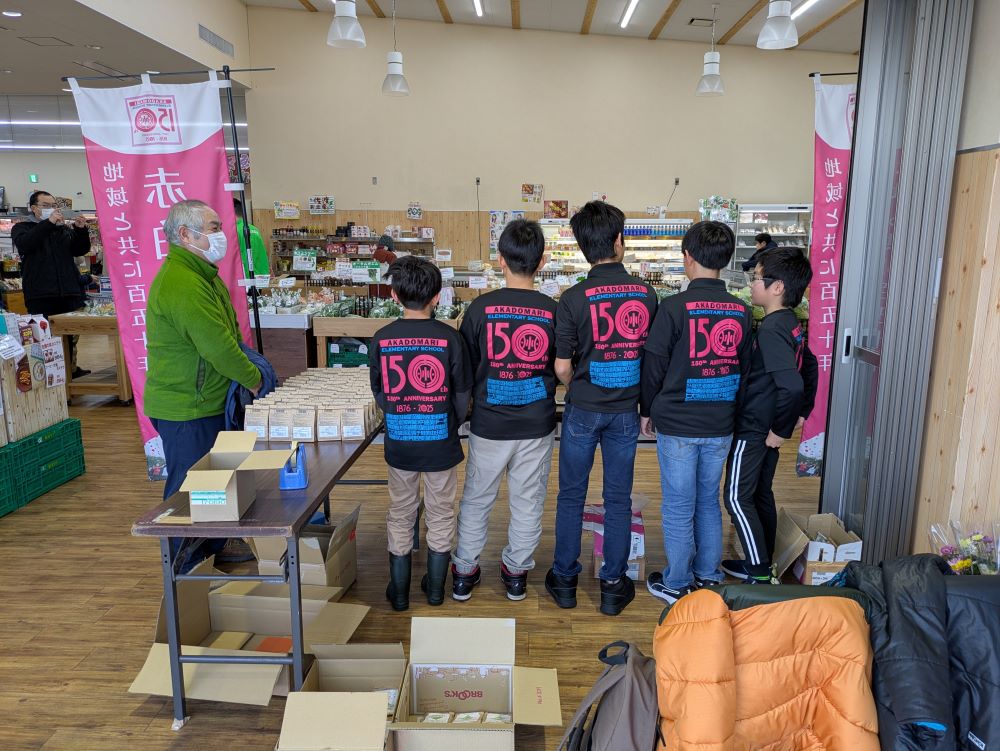 新鮮空間「よらんか舎」で、学校田で育て、収穫したお米を販売してきました。