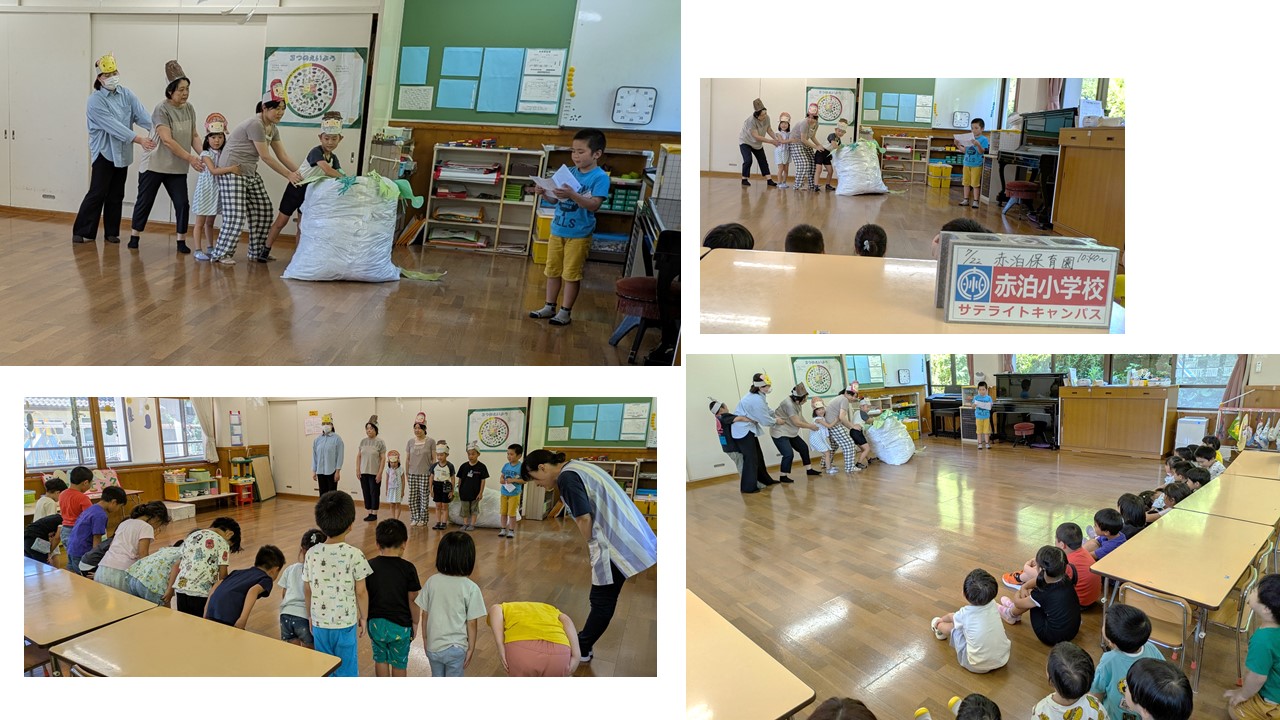 1年生が赤泊保育園に国語の音読劇「大きなかぶ」を披露しに行きました。