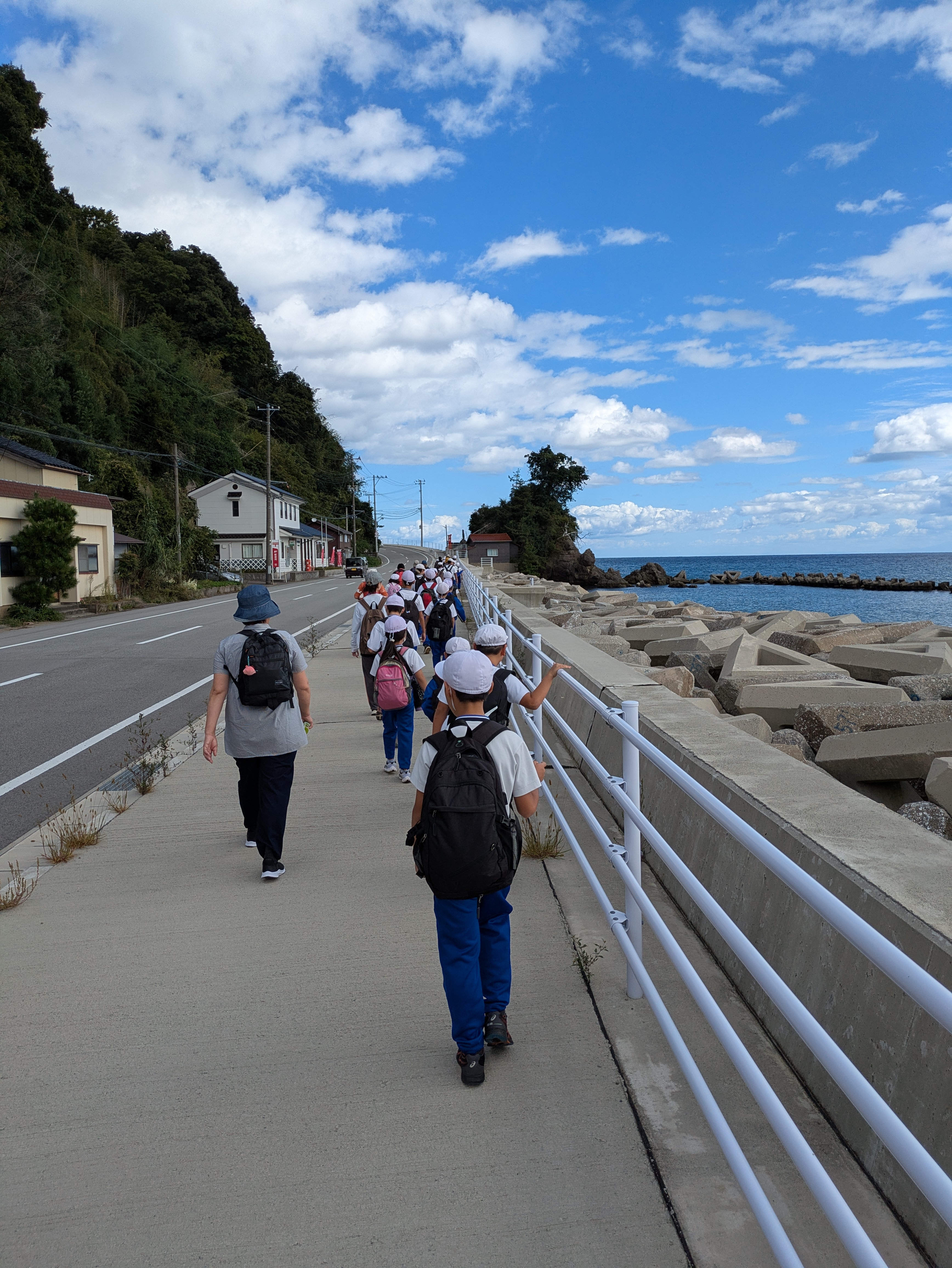 佐渡海洋深層水(NISACO)工場見学 ⇒ 松ヶ崎町並み保存地区 ⇒ 松ヶ崎ヒストリーパークのおよそ2.5kmルートを全校で歩きました。