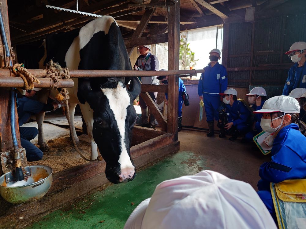 始めに搾乳の様子を見せていただきました。牛乳が私たちのところに届くまでの一番最初の場面をとても興味深そうに見学していました。