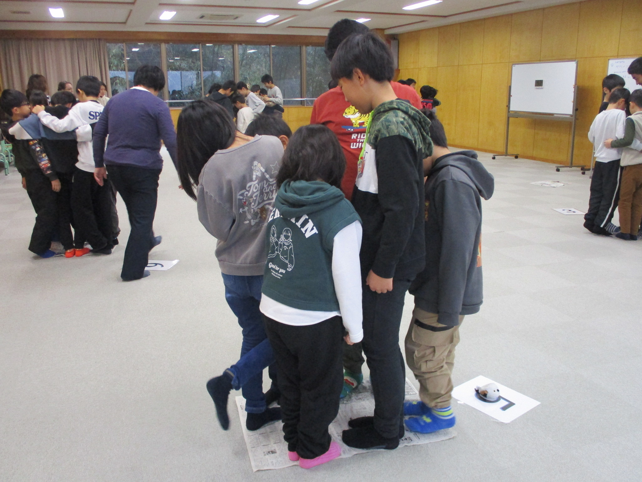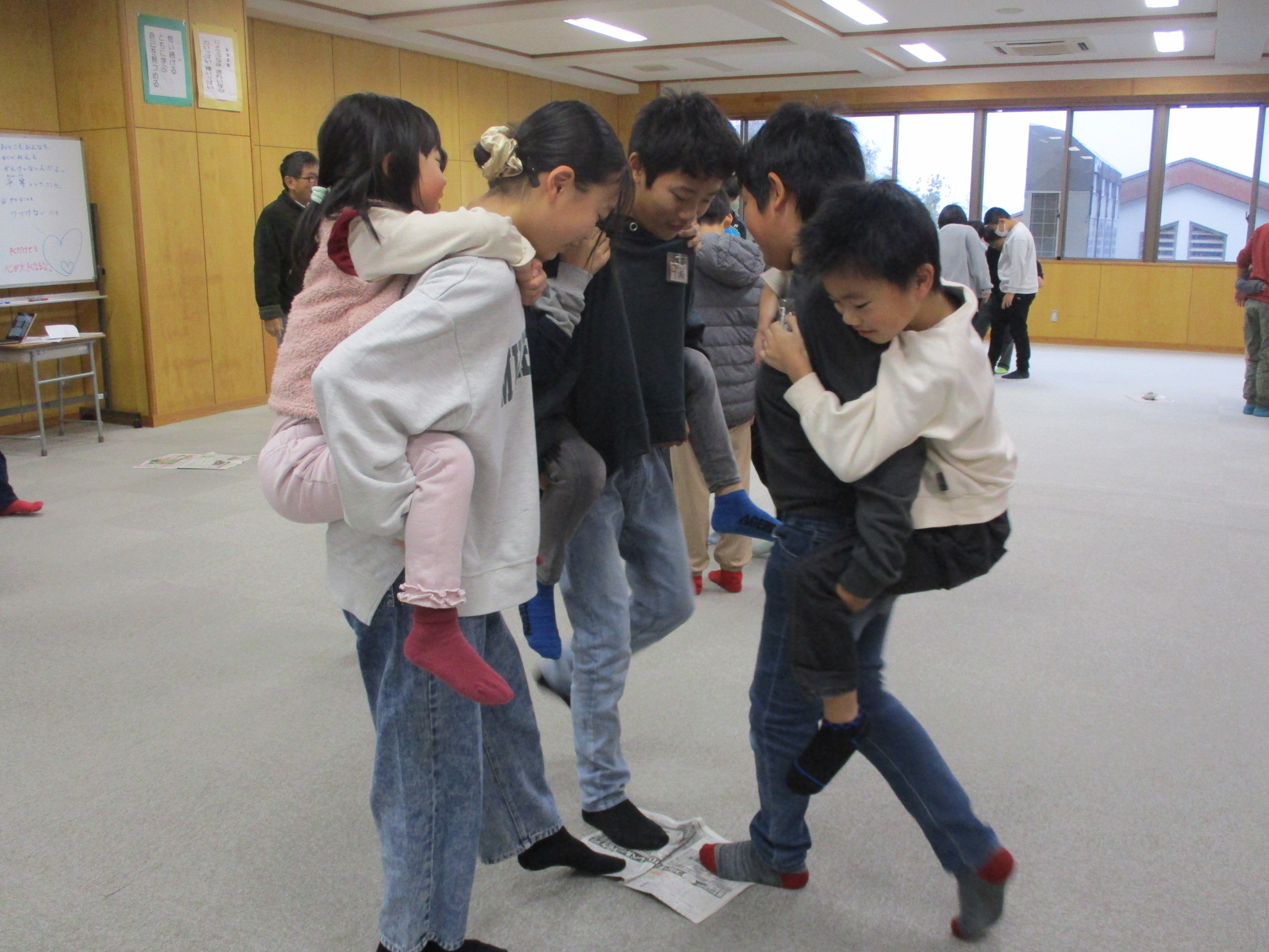 クリスマス集会では、縦割り班ごとに「新聞紙に乗るゲーム」を楽しみました。最初は広い新聞紙に班の仲間全員で乗り、余裕のある様子でしたが、ゲームが進むにつれて新聞紙をどんどん折りたたみ、乗れる面積が小さくなっていきます。小さくなった新聞紙にどうやってみんなで乗るかを考え、肩を寄せ合ったり、おんぶしたりしながら工夫する姿が見られました。高学年が低学年を支えたり、声を掛け合ったりする場面もあり、班の絆が深まる楽しい時間となりました。