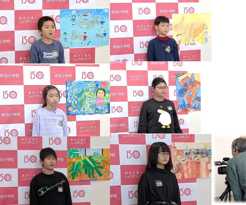 27日(火)に、佐渡テレビで放送される「将来の夢(市内の小学6年生が将来の夢を語る)」と「さどっこ画廊(代表児童の絵画の紹介)」の収録を行いました。「さどっこ画廊」では、代表の子どもたちは、緊張しながらも、堂々と自分の作品の気に入っている所やこだわったところを紹介していました。「将来の夢」では、自分が将来どんな仕事に就きたいかとその理由を答えていました。